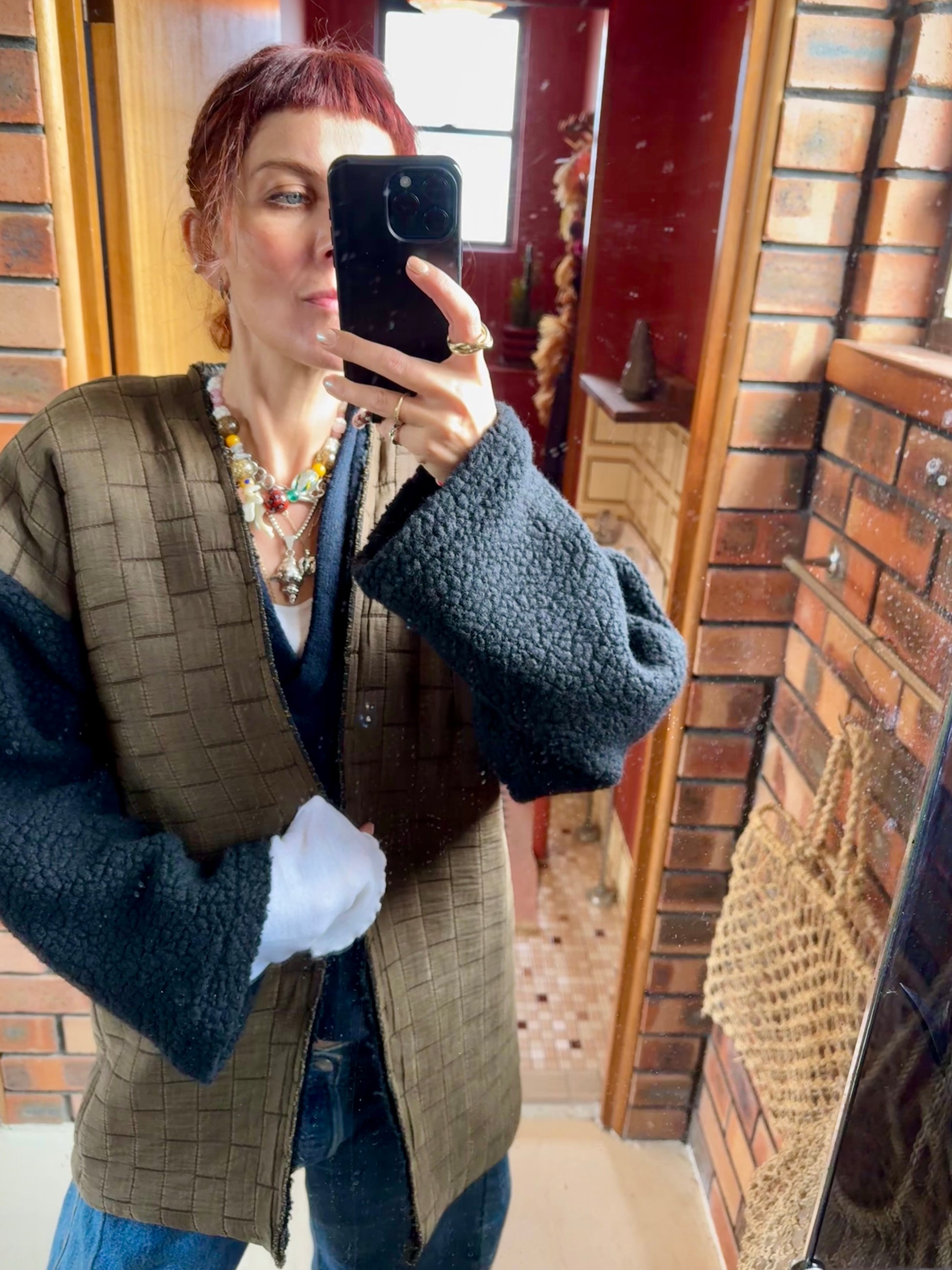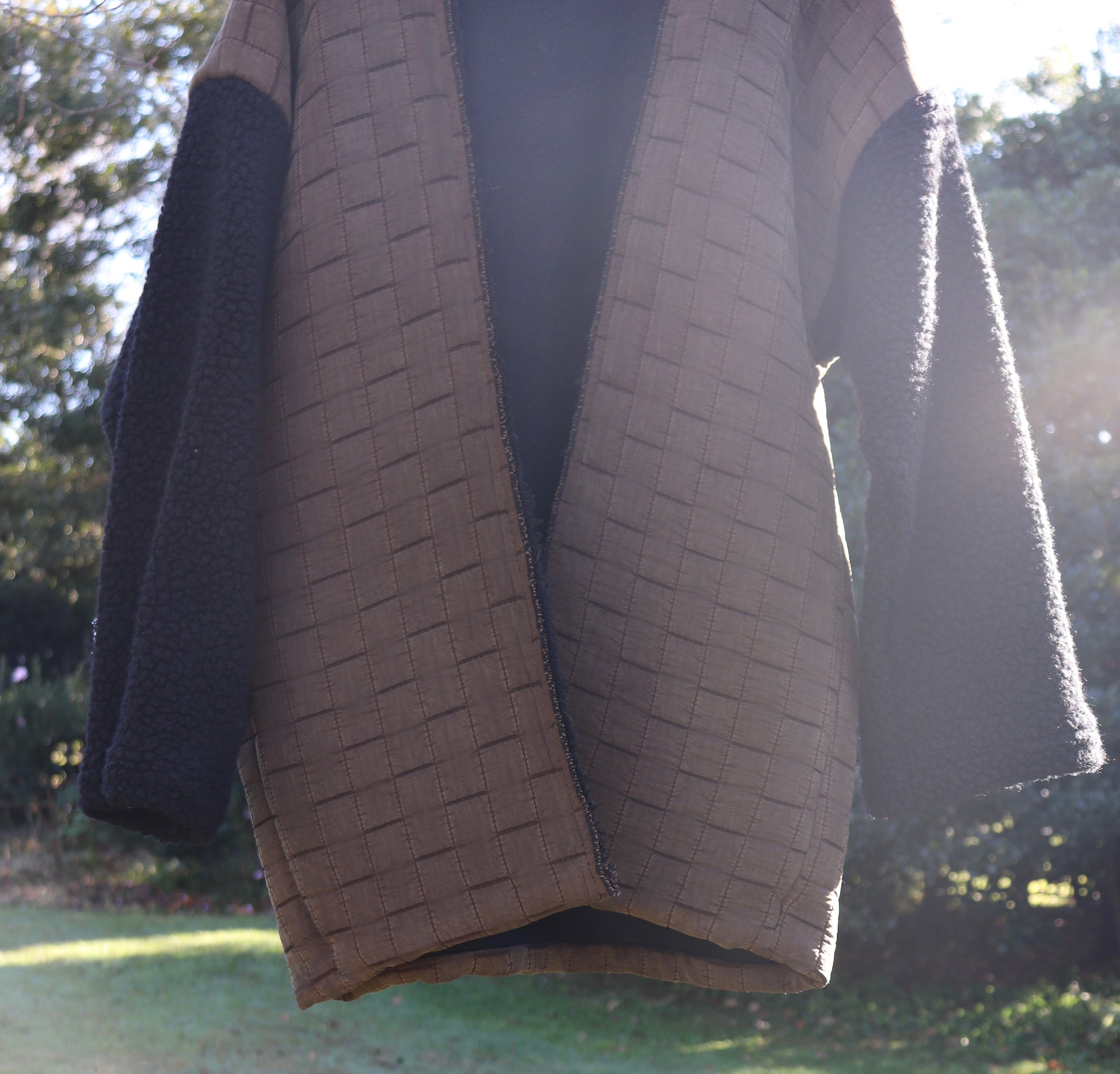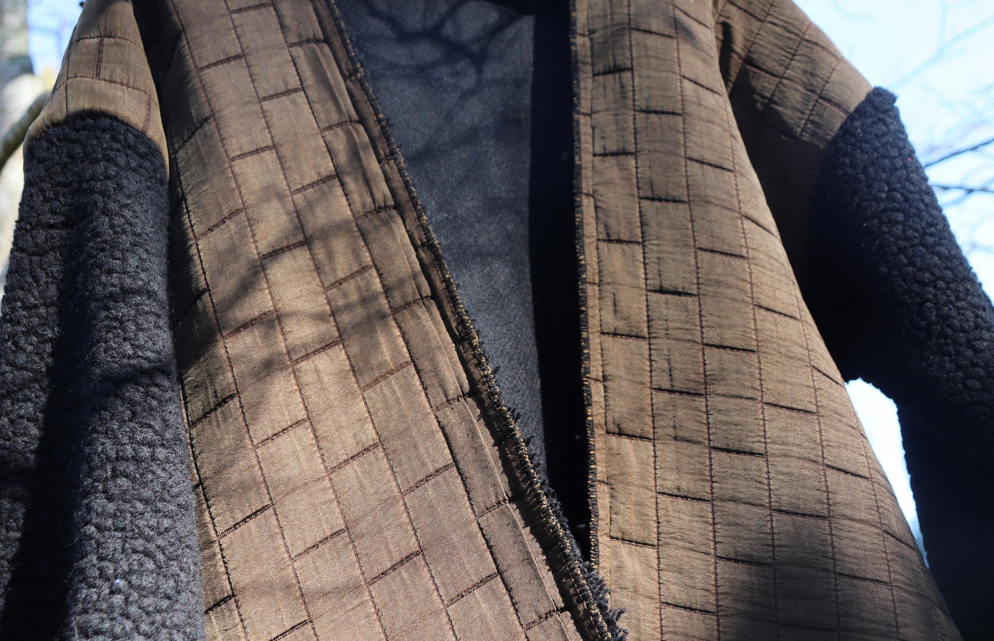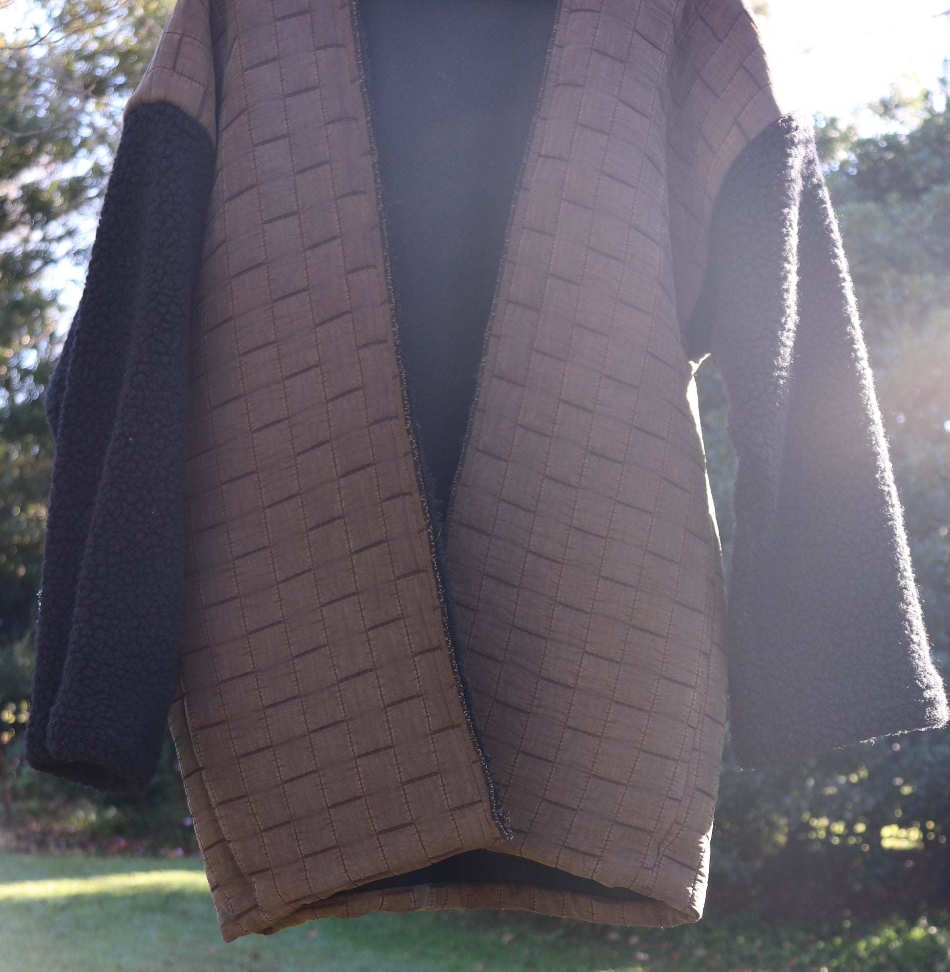 A one-of—kind patchwork kimmo, made with italian wool Sherpa silk & italian quilted brushed cotton. Incredibly timeless piece