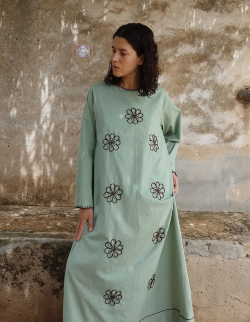 FLOWER ORGANIC DRESS WITH EMBROIDERY- SAGE