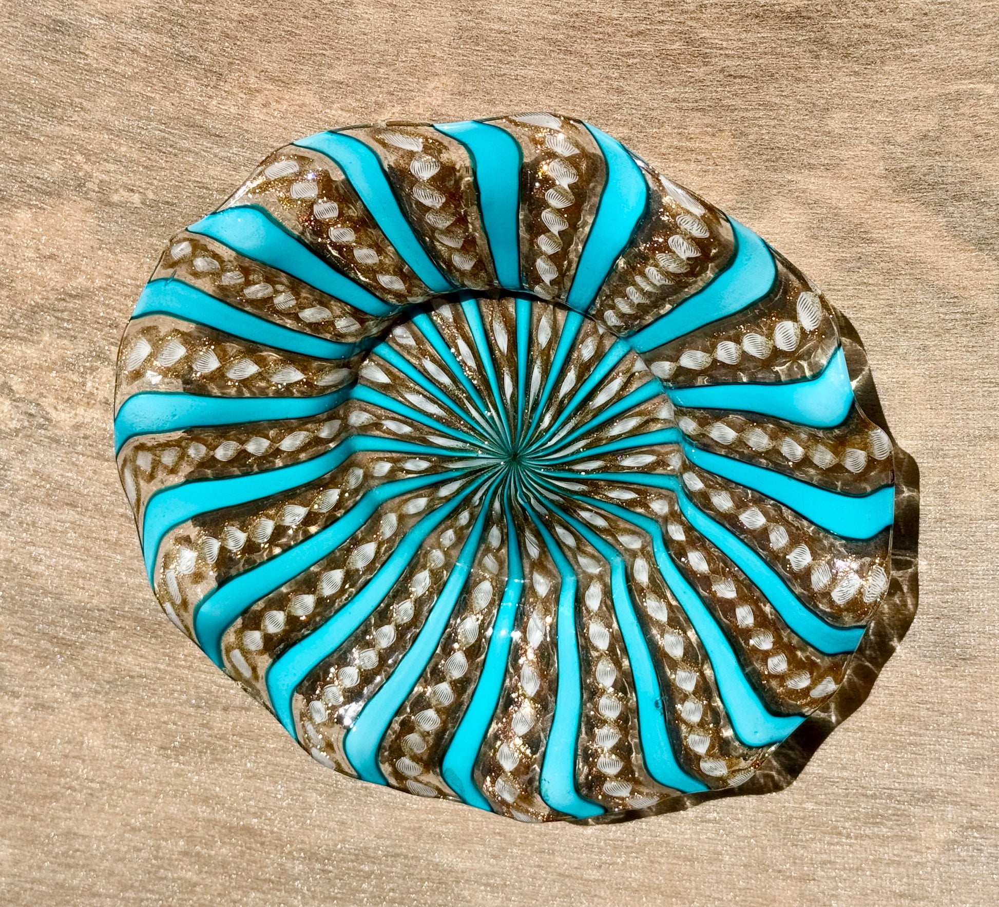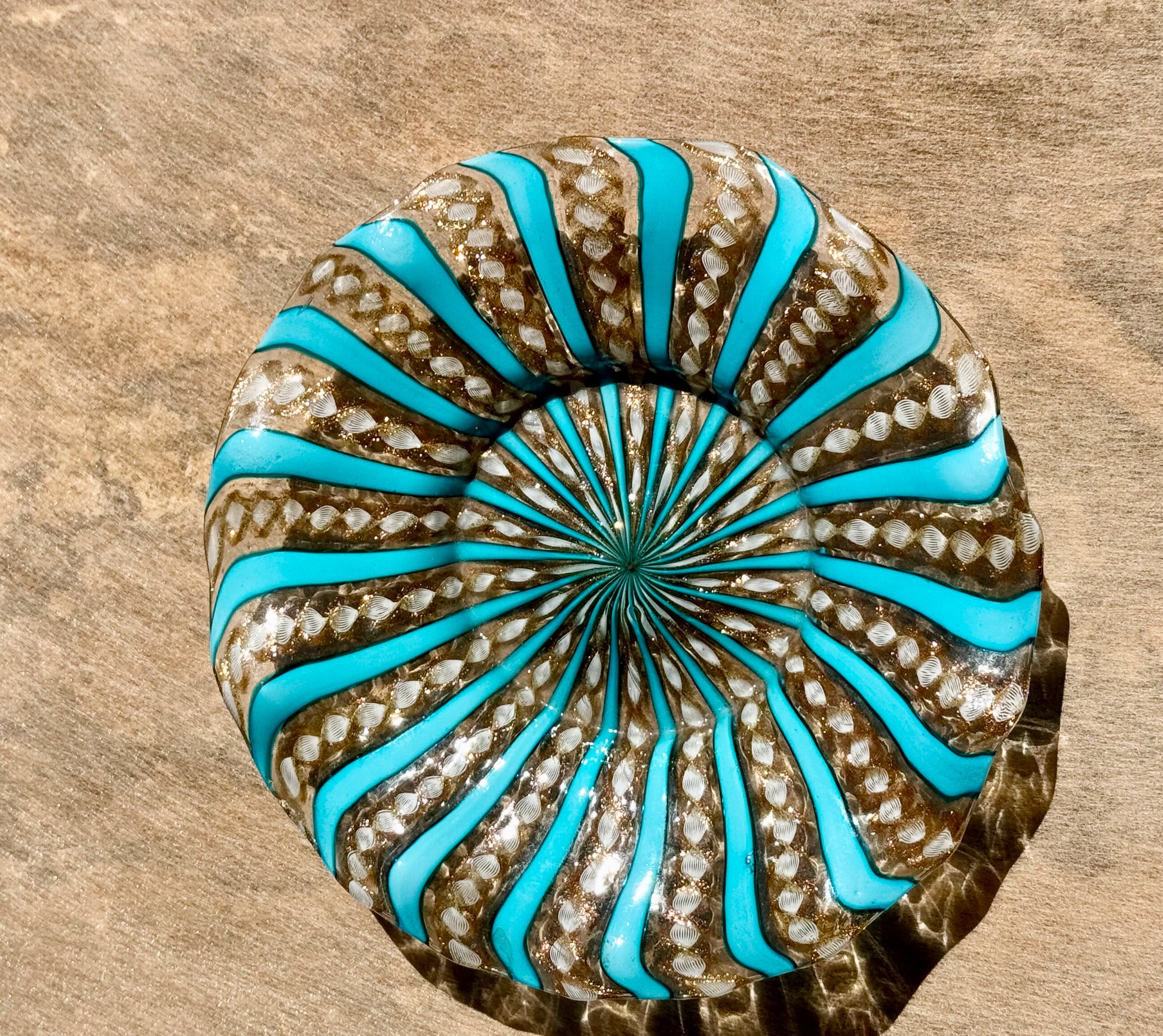 Late 1960s Murano Glass small plate, a stunning blue with gold detailing. A collectable piece, and a stunning addition to any home. W.20cm.