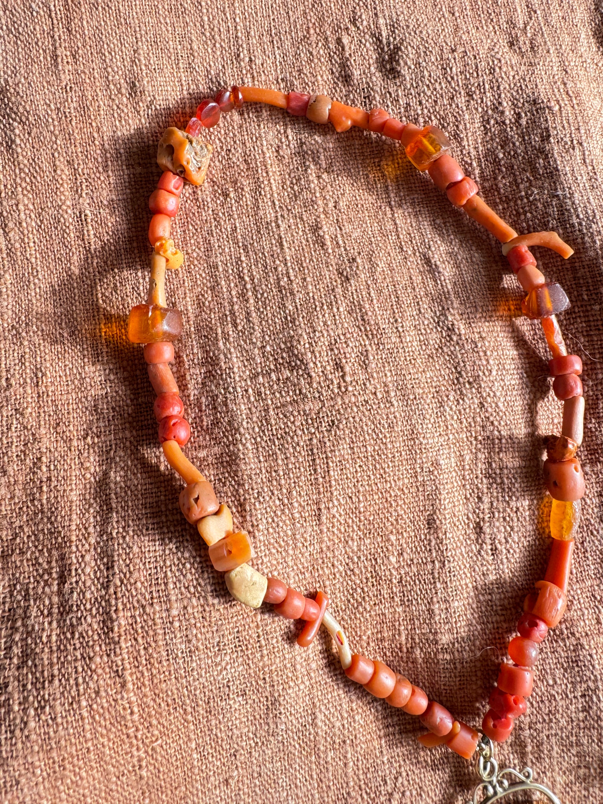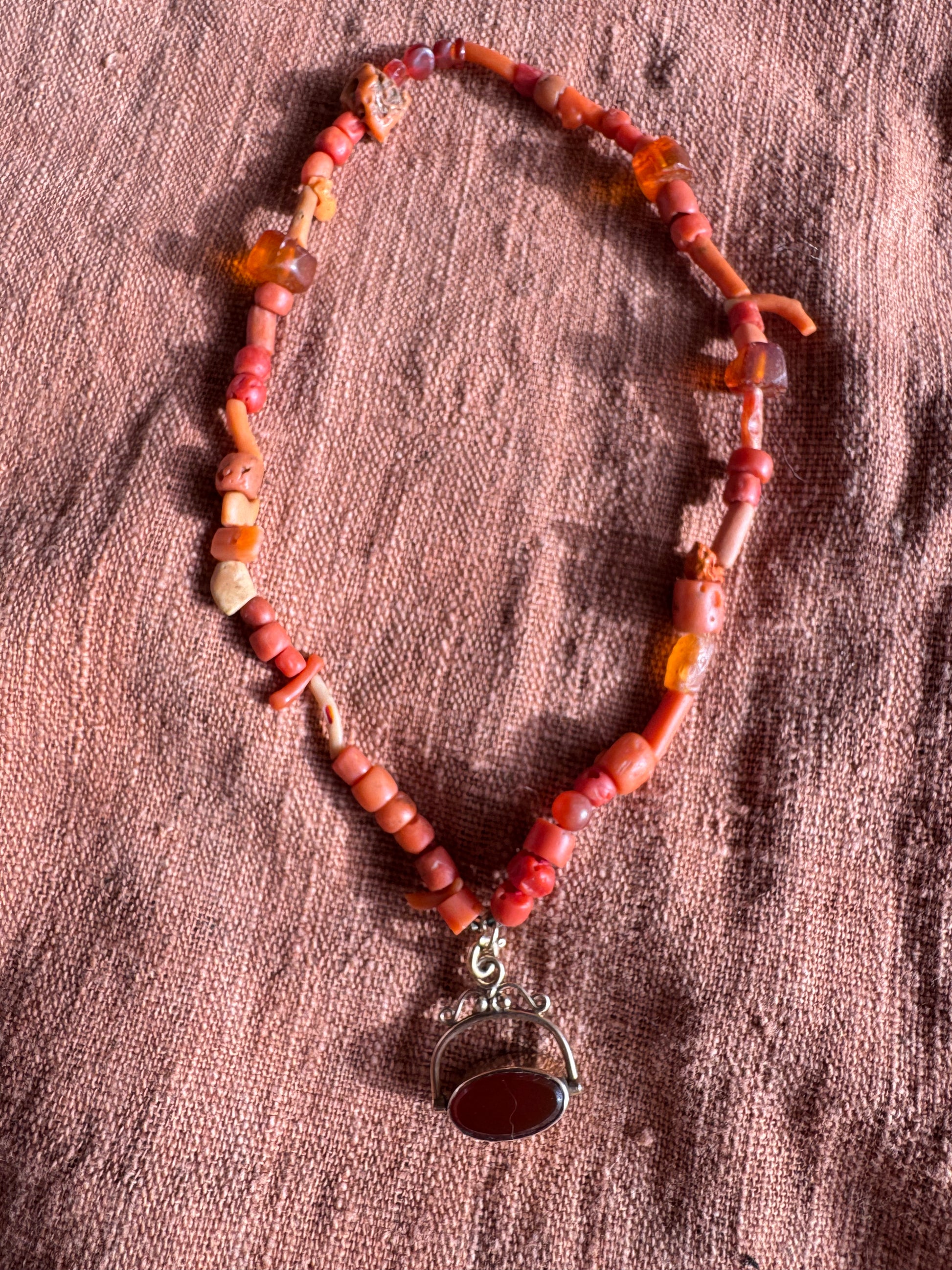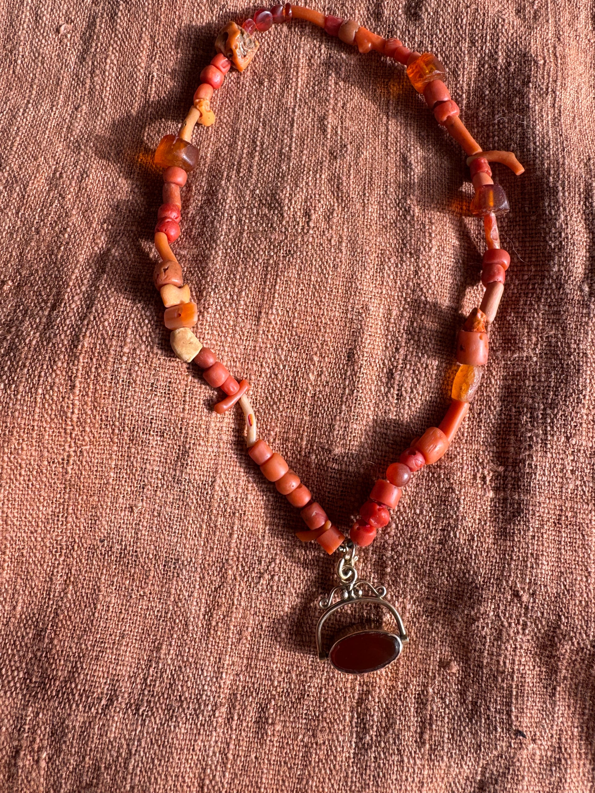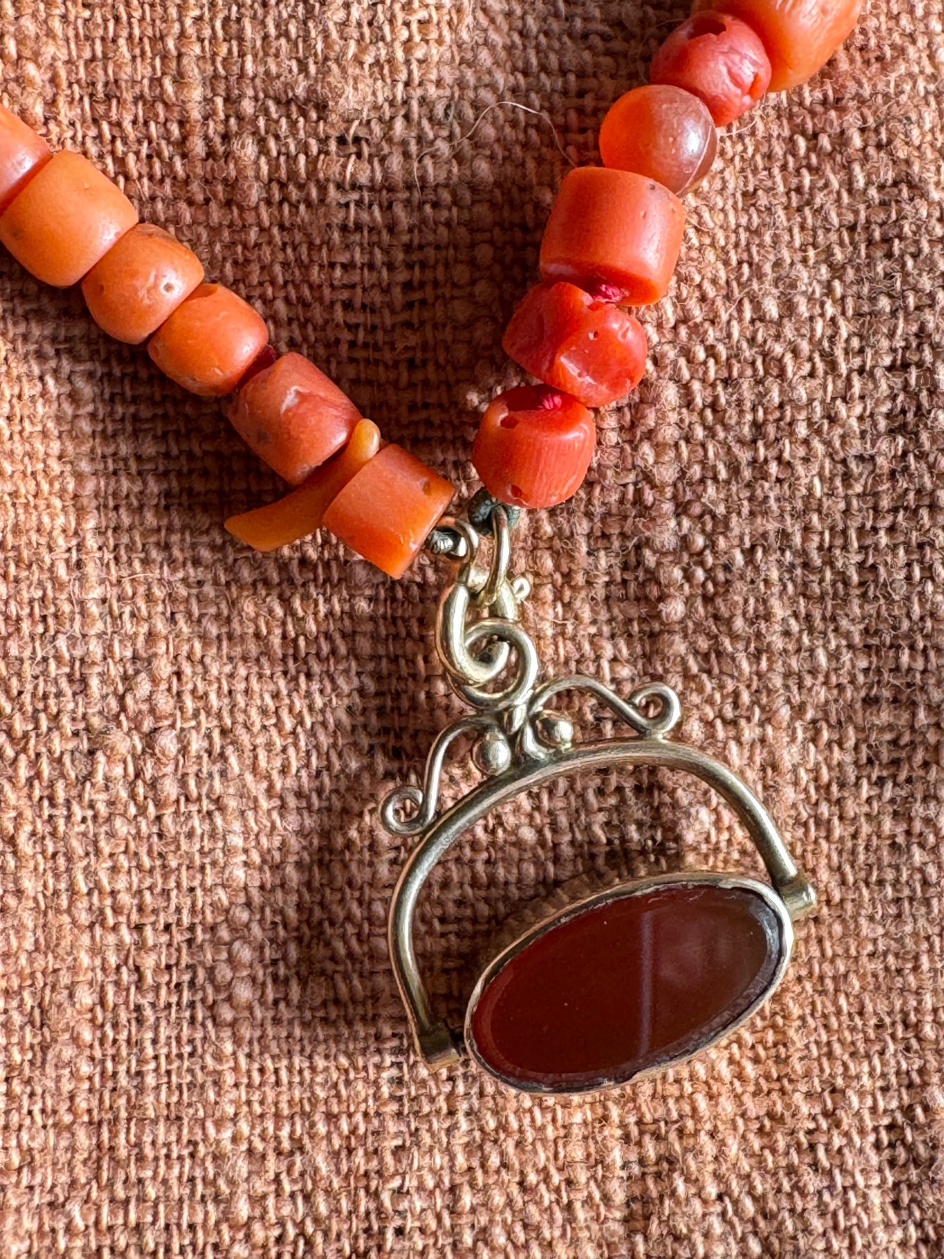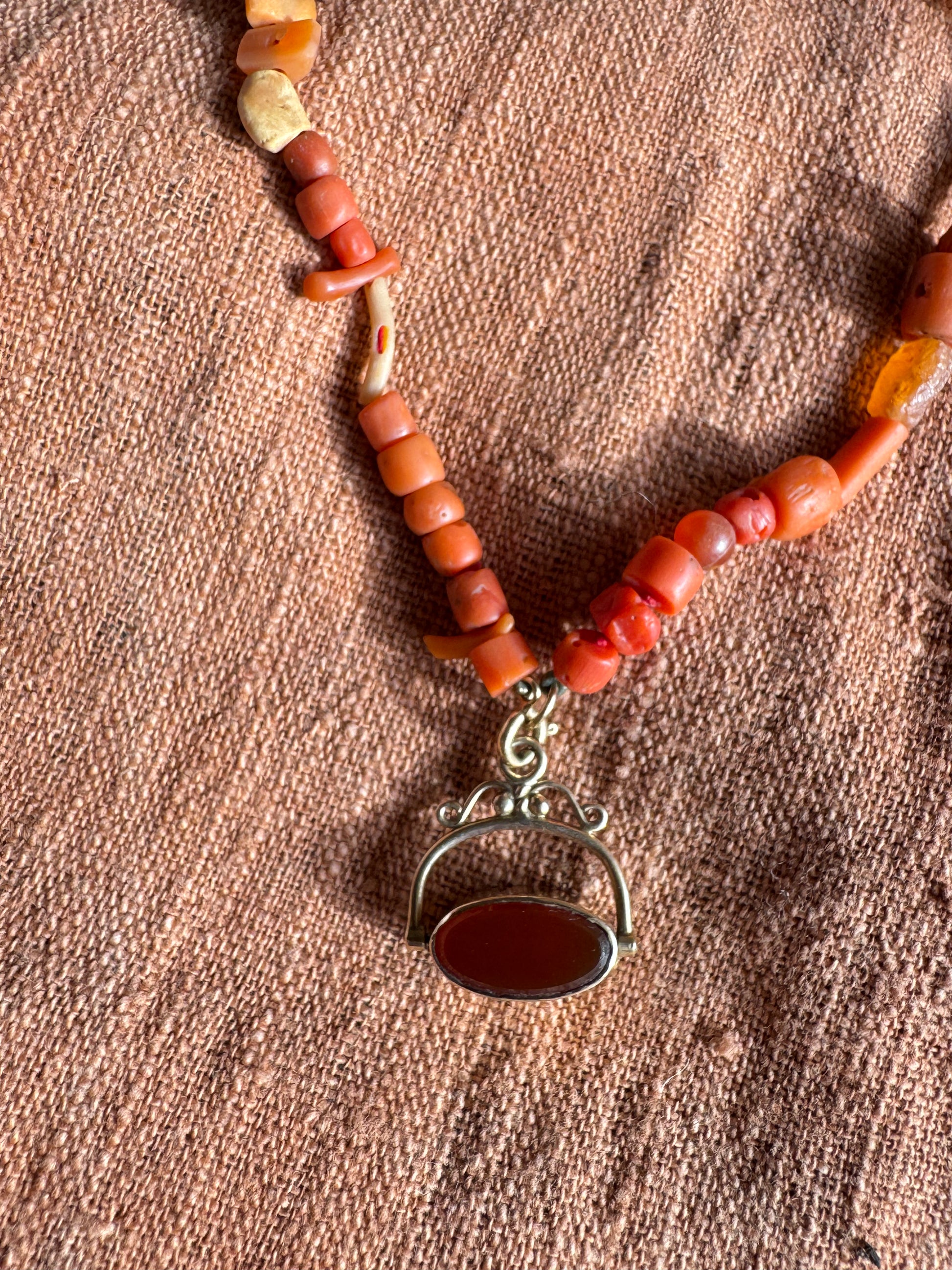 necklace feat. Ancient coral and a 9ct gold carnelian (vintage) pendant, the pendant spins. Sold as one piece.