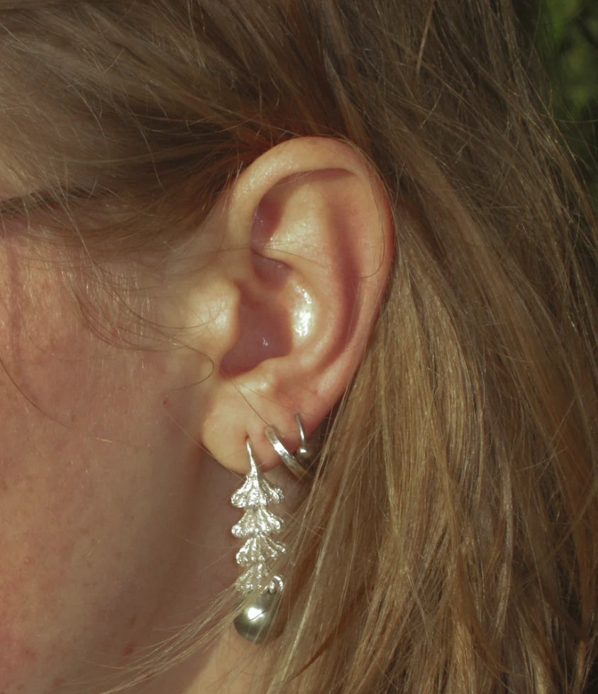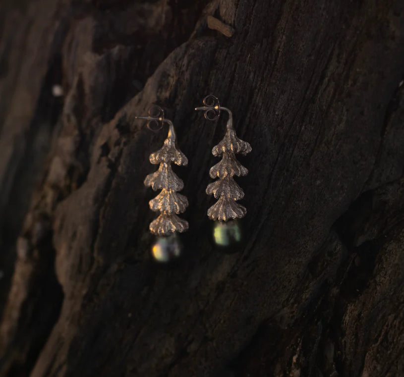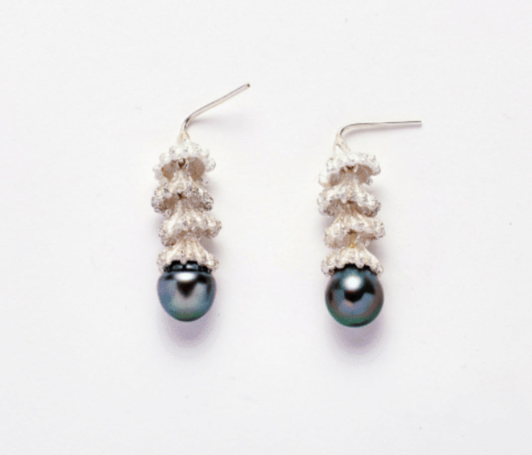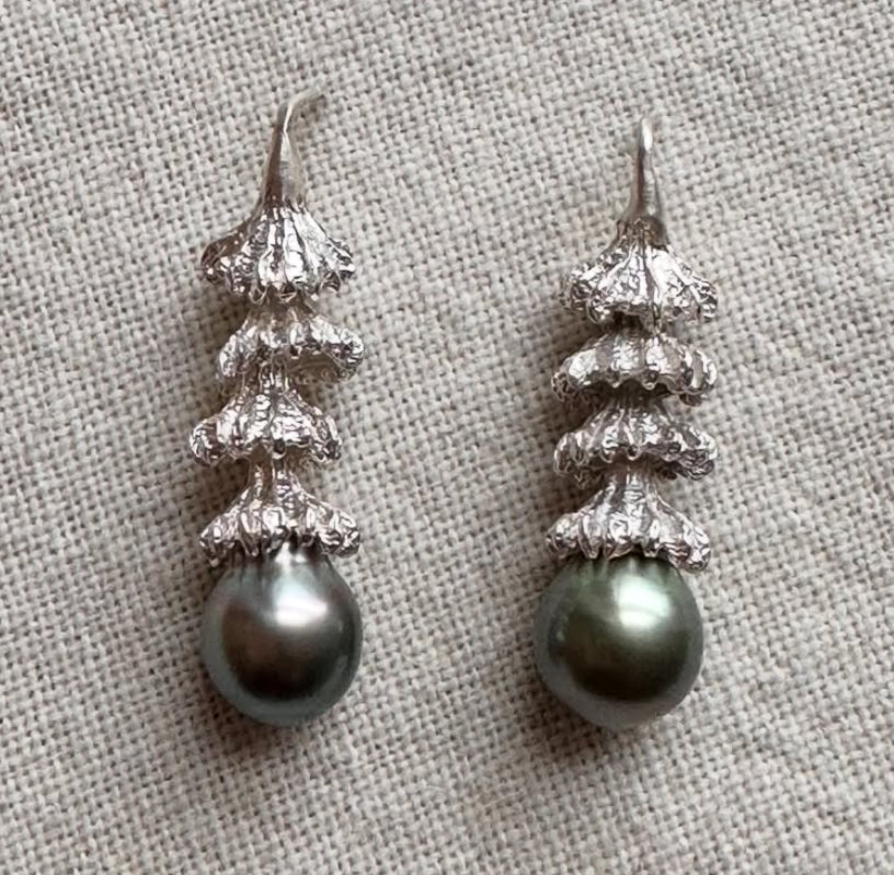 Silver cast seed pods articulated for delicate movement, capping moody Tahitian pearls.