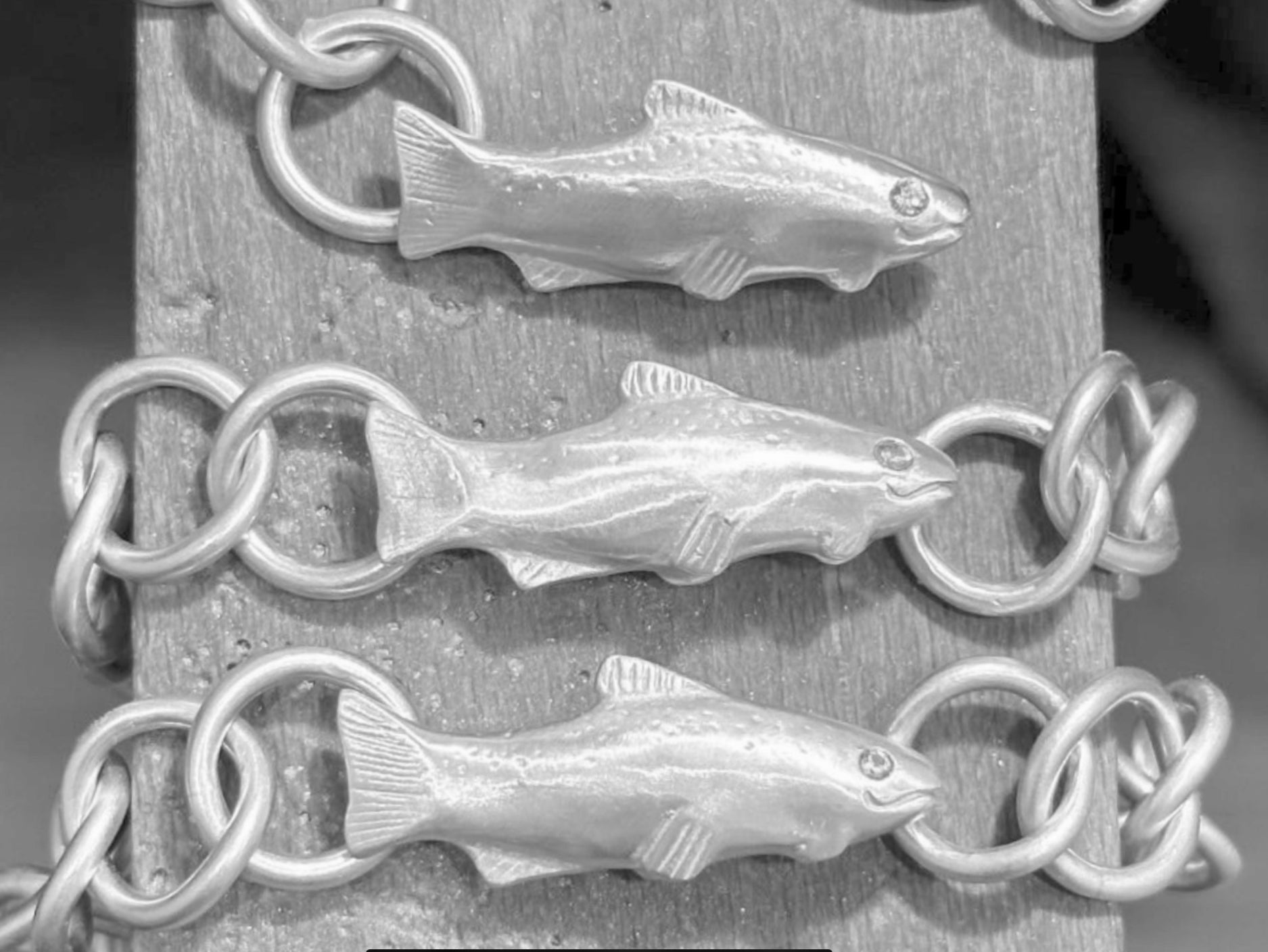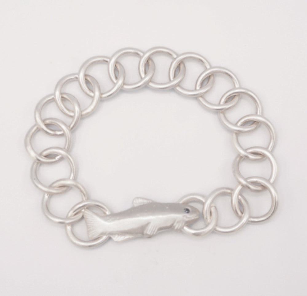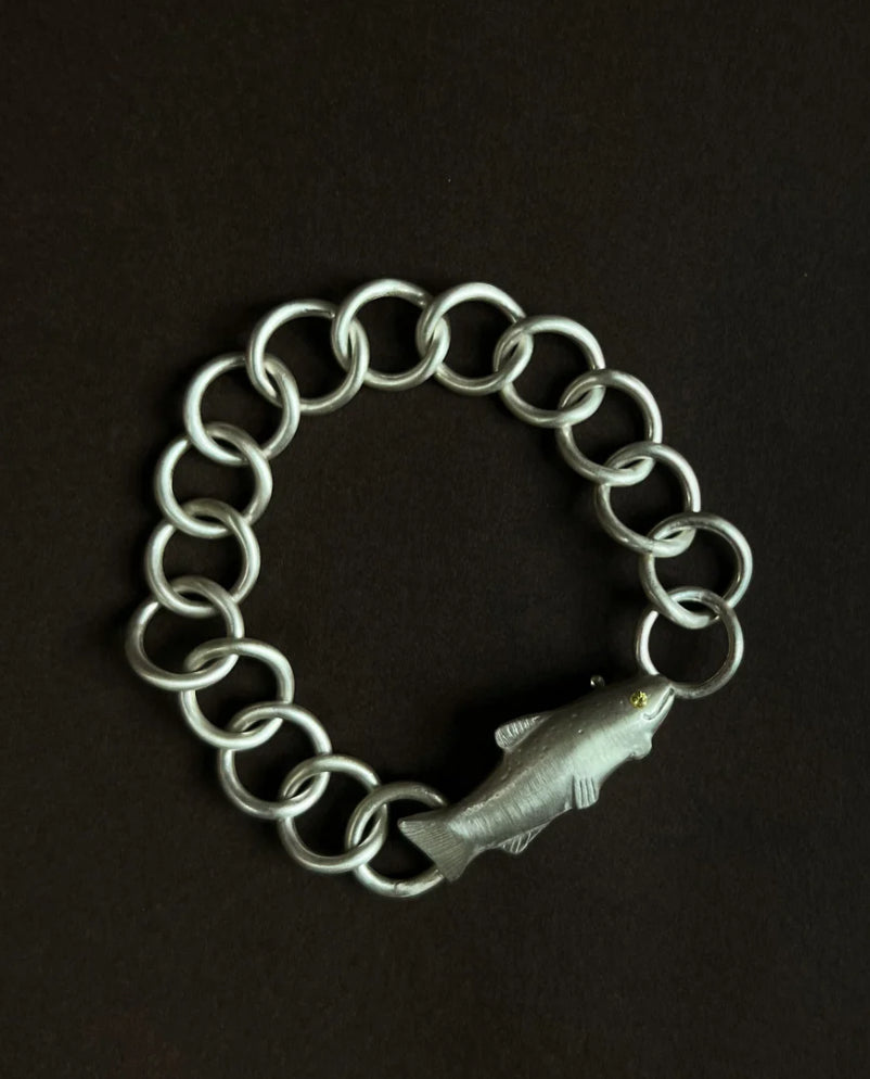 A freshwater species as the catch on a hand fabricated curb chain, with twinkling sapphire eyes.