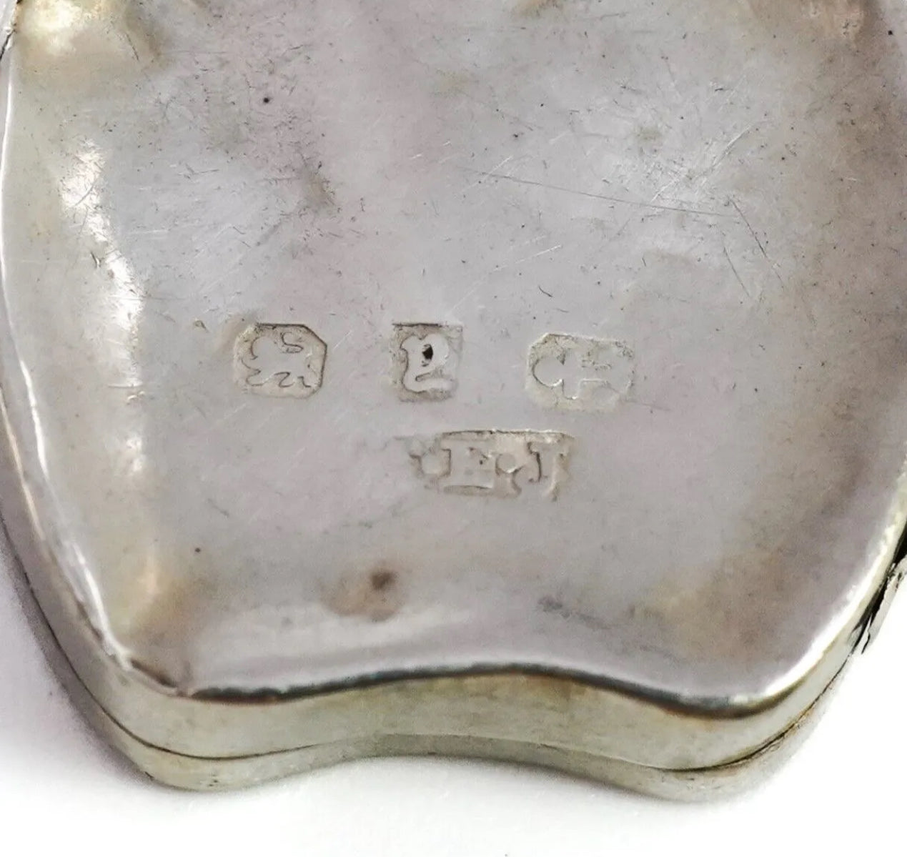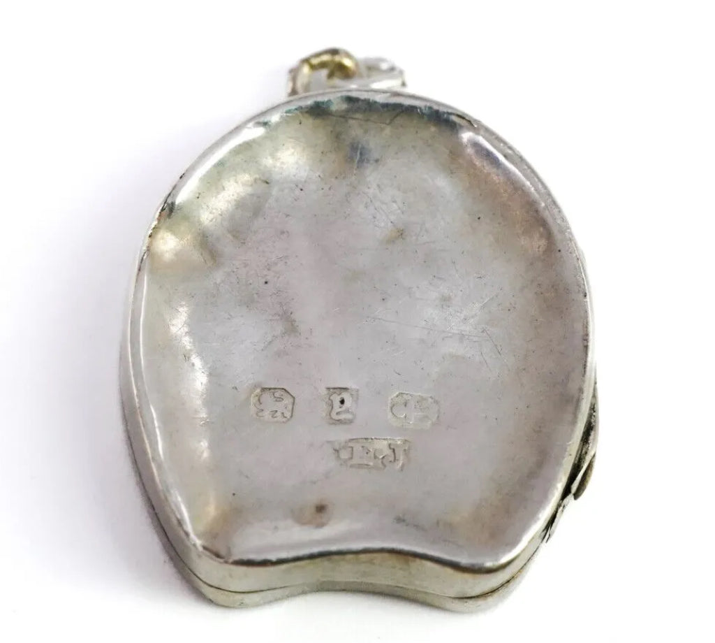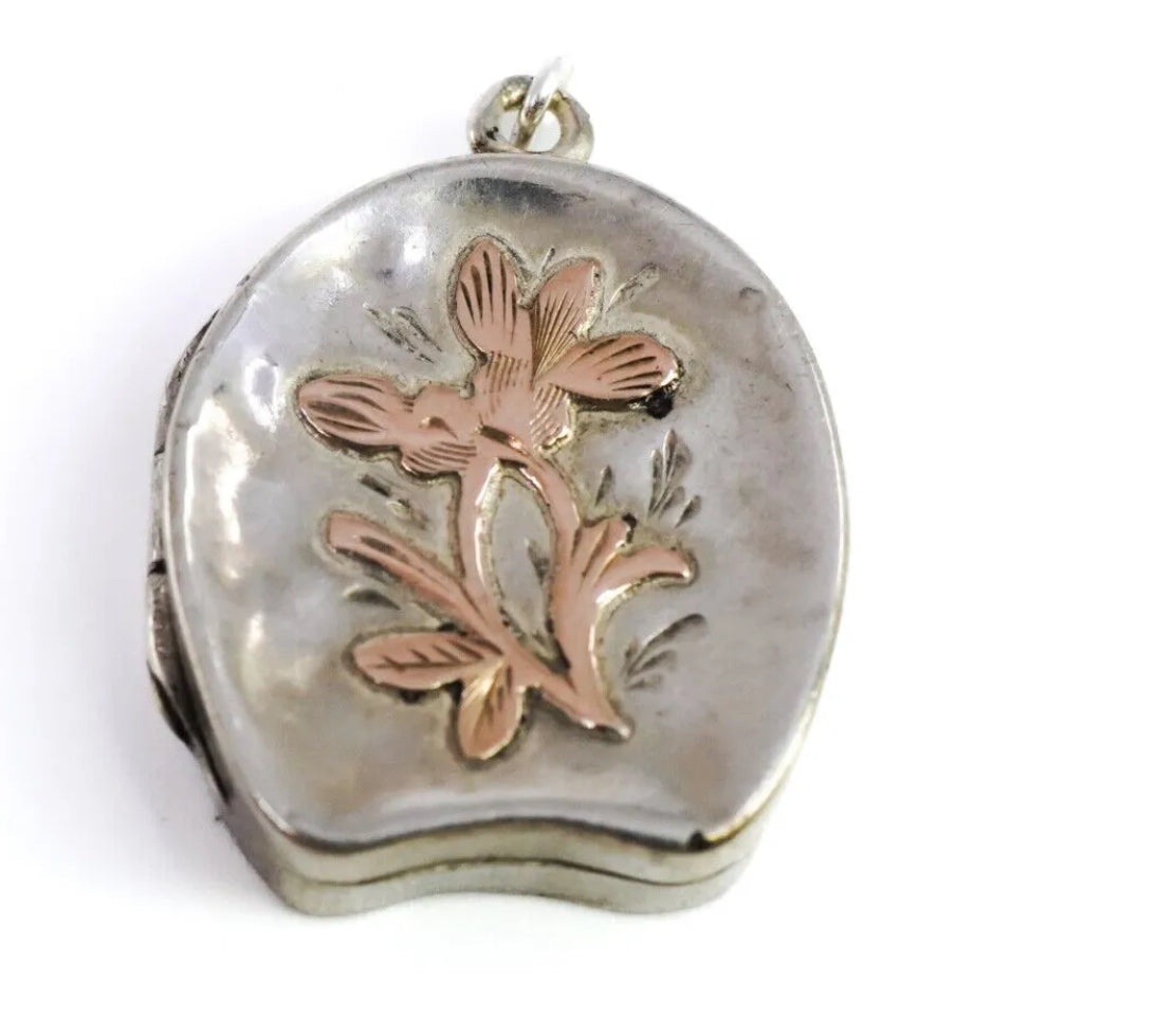 This adorable little sterling silver pendant was crafted back in 1898, making it over 126 years old. It was assayed in Birmingham, England and has the makers mark E.J. The front has a rose gold inlaid flower. This pendant is small and measures 19.8mm x 16.1mm.