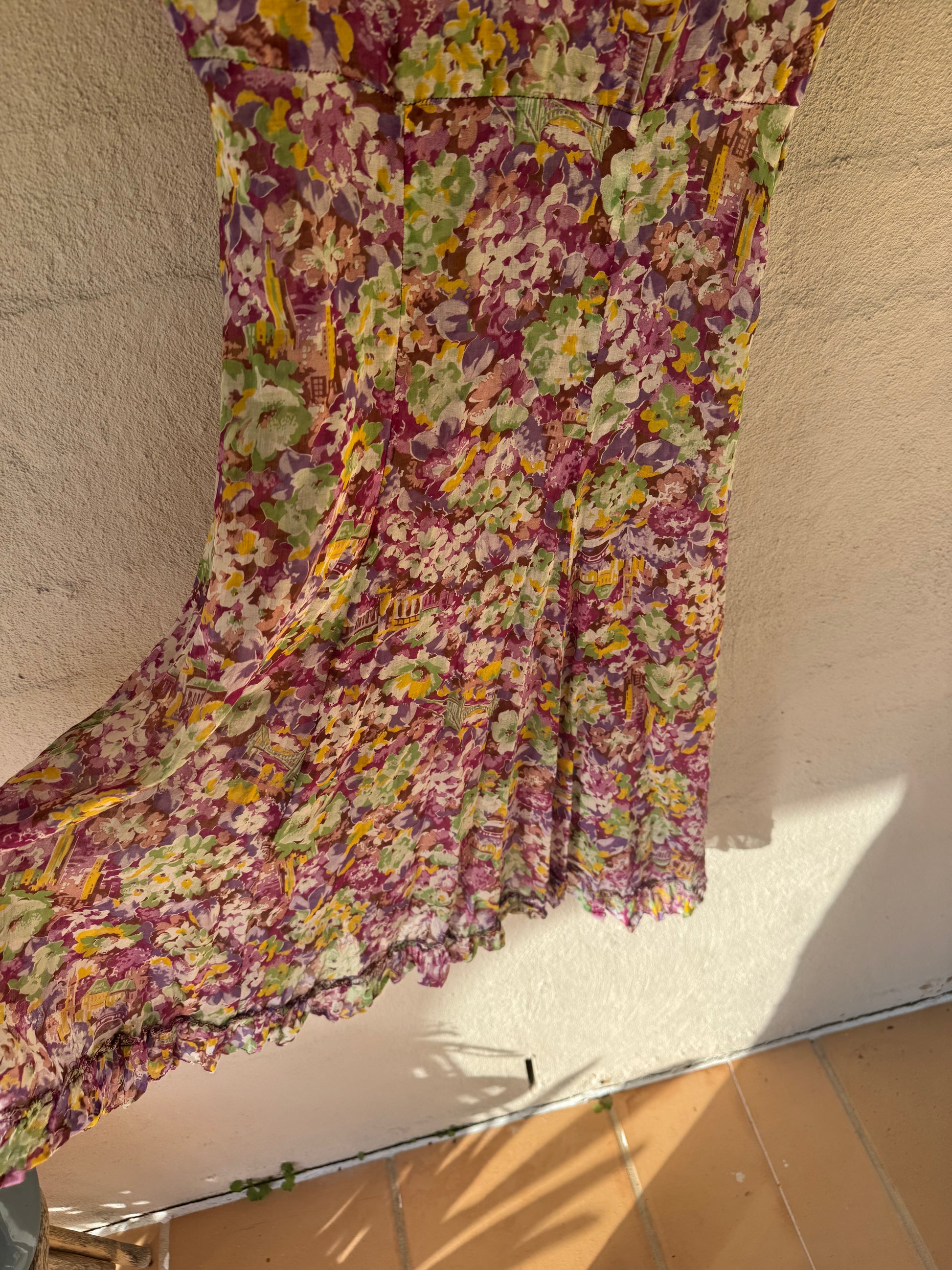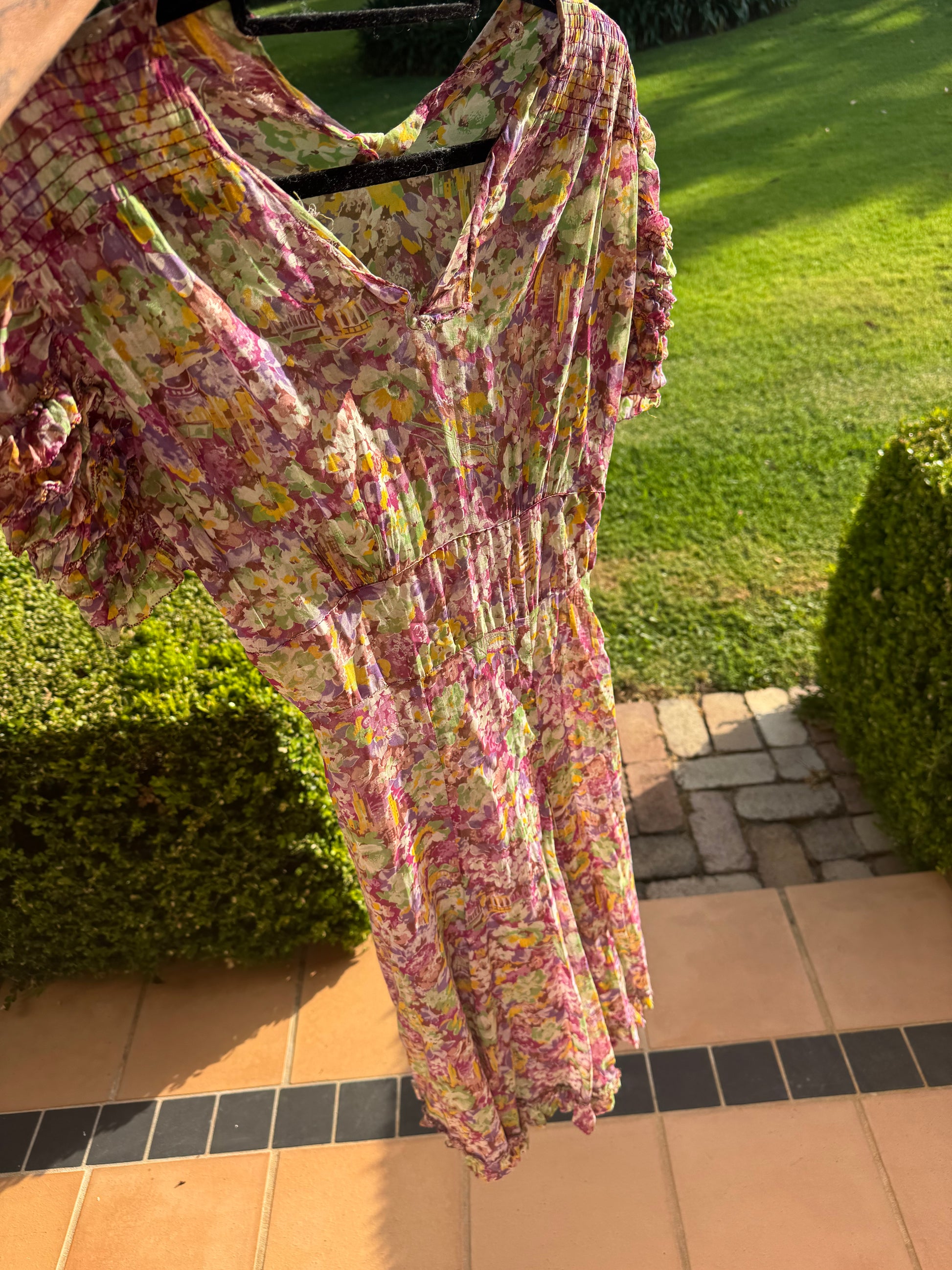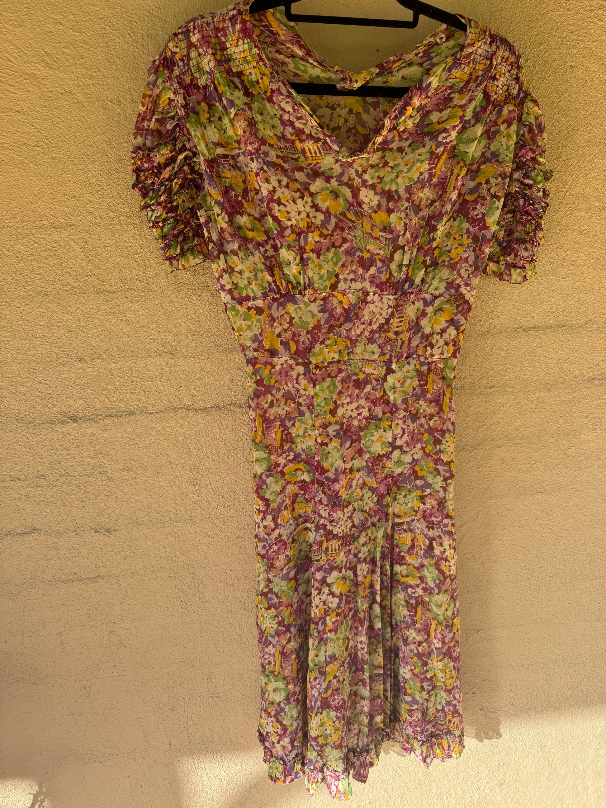 This stunning Cotton vintage dress, with sheer floral print. So stunning and flattering on. Perfect on its own or worn with floppy pants or long skirt underneath. Found in California